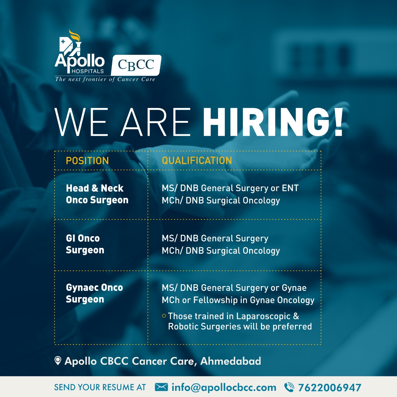 The interested and eligible surgeons who wish to apply any of the above posts are requested to send their resume along with a covering letter to sog@cancerinstitutewia.org Intimation for a formal Interview will follow.